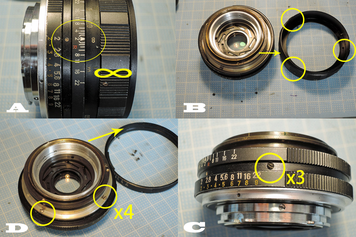 D: 指標リングを外したら、ヘリコイドユニットを固定している4個のネジを外します。