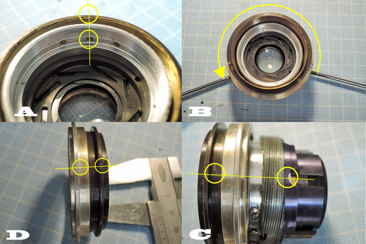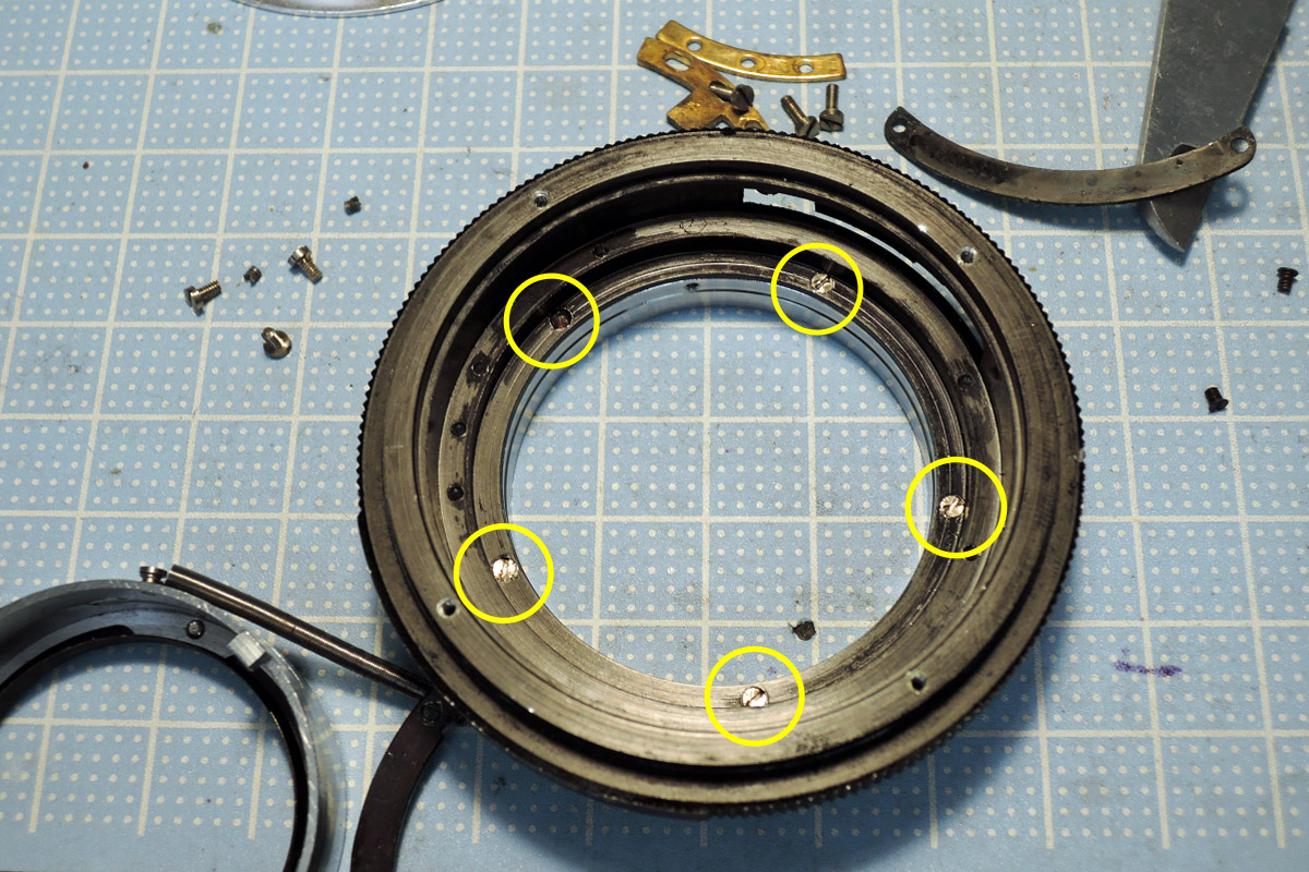 C: 絞り羽根のクリアランス調整リングを外したら絞り羽根固定部の位置マーキングをしておきます。