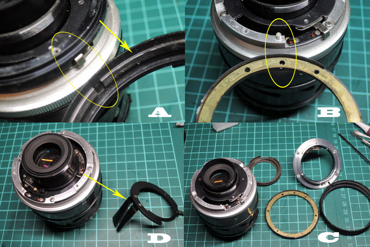 D: 絞り連動リングの取付位置を確認しながら外します。