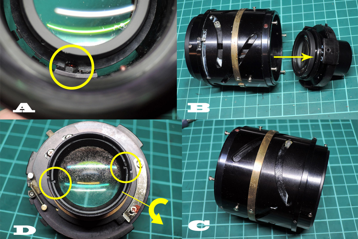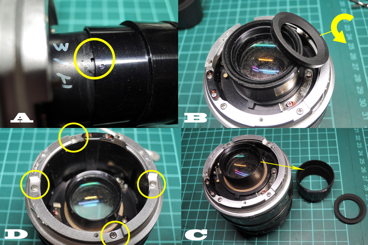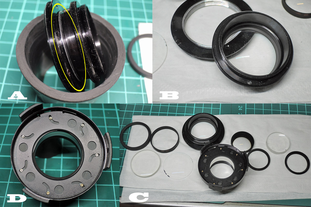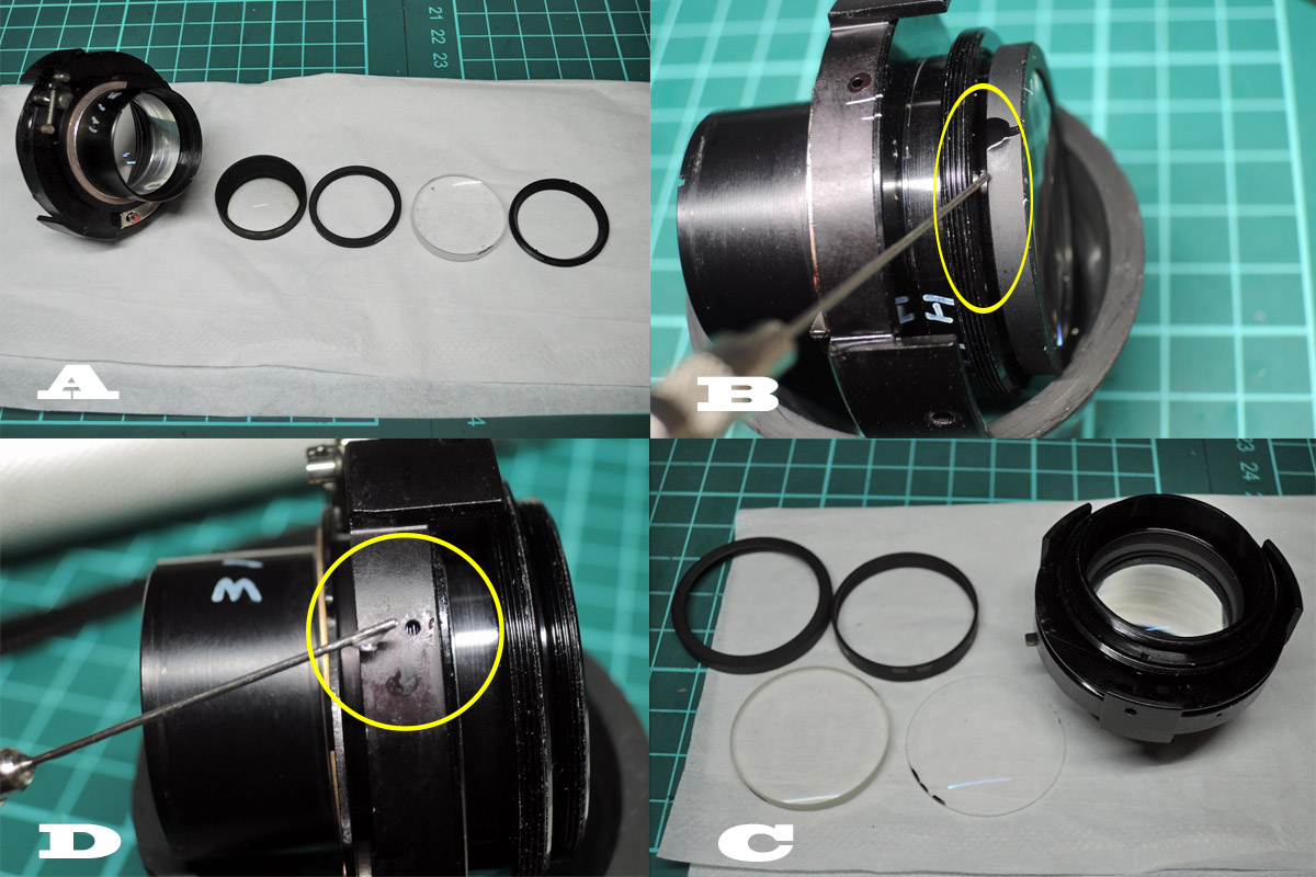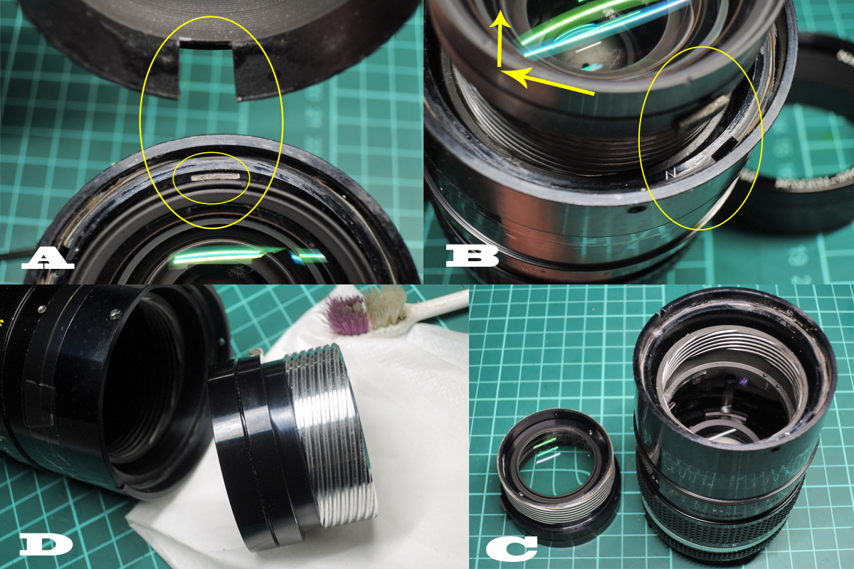 D: 後玉を固定しているロックリングを外しますが、固い時はアセトンを染み込ませてから行って下さい。
