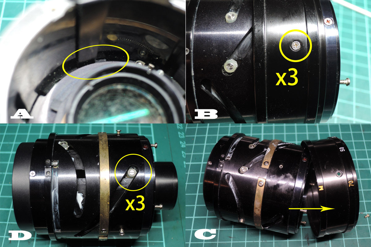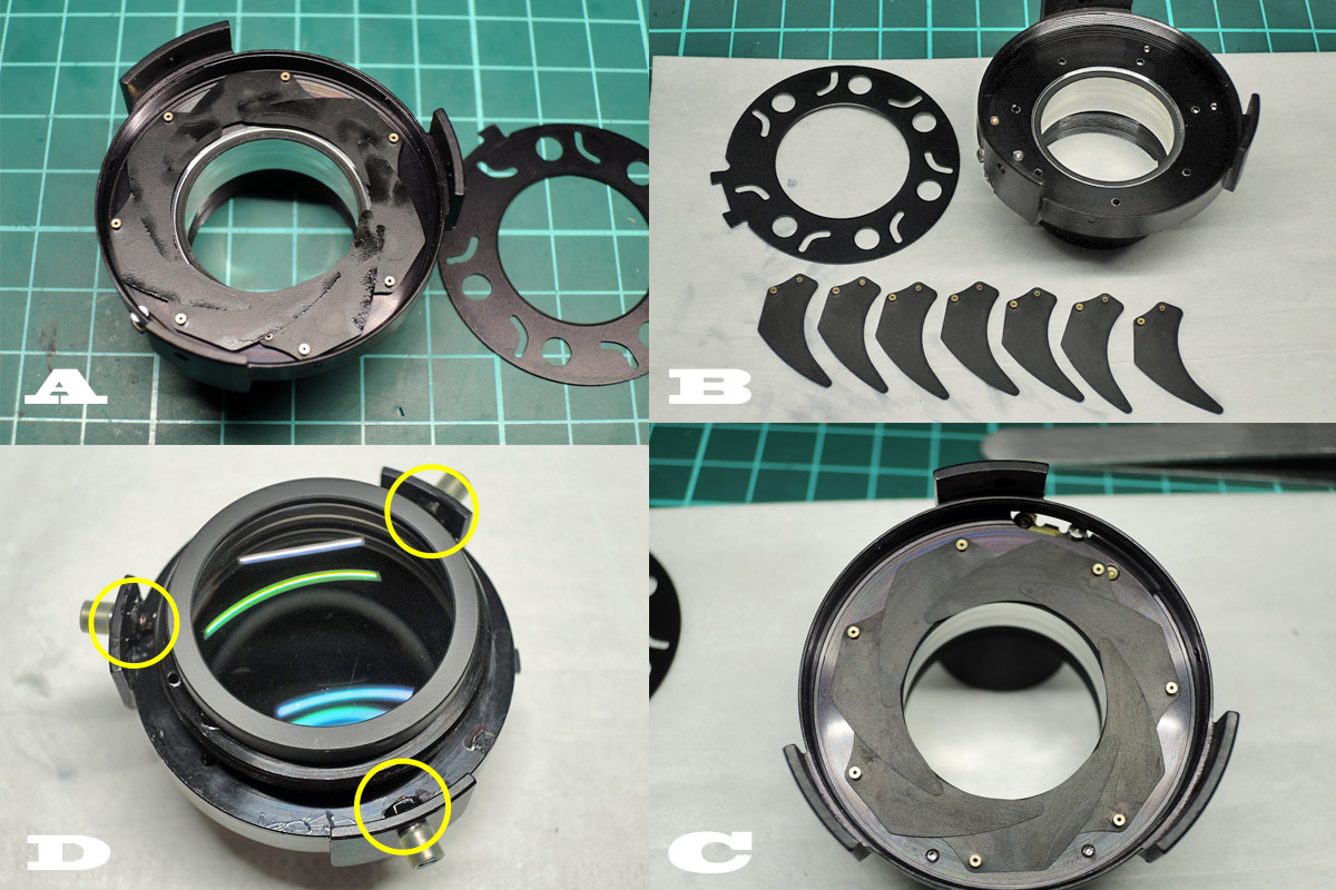 C: 各レンズを清掃して組み立てますが、絞り羽根を清掃する場合は次に進んで下さい。