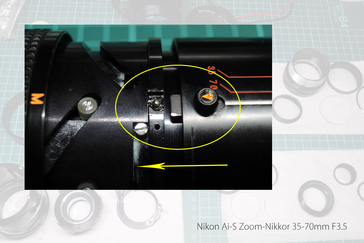 A: 絞りリングの取付位置を確認しながら絞りリングを外しますが、このレンズはクリックボールではなく板バネなので、そのまま外せばOKです。