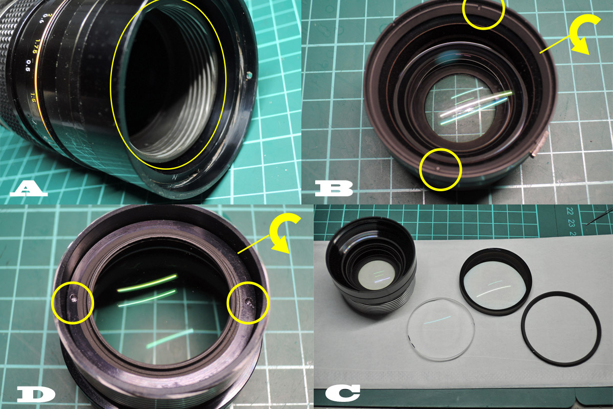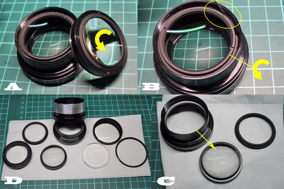 B: レンズを固定しているロックリングを外しますが、固い時は無理をせずにアセトンを染み込ませて数分待ってから緩めるか、ドライヤーで加熱してから緩めるといいです。