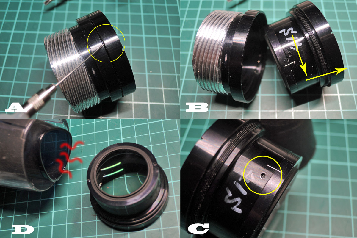 B: ゆっくり慎重に前群レンズユニットを回し、外れるまでの回転数と外れる瞬間の位置を♀ヘリコイド側にマーキングしておきます。