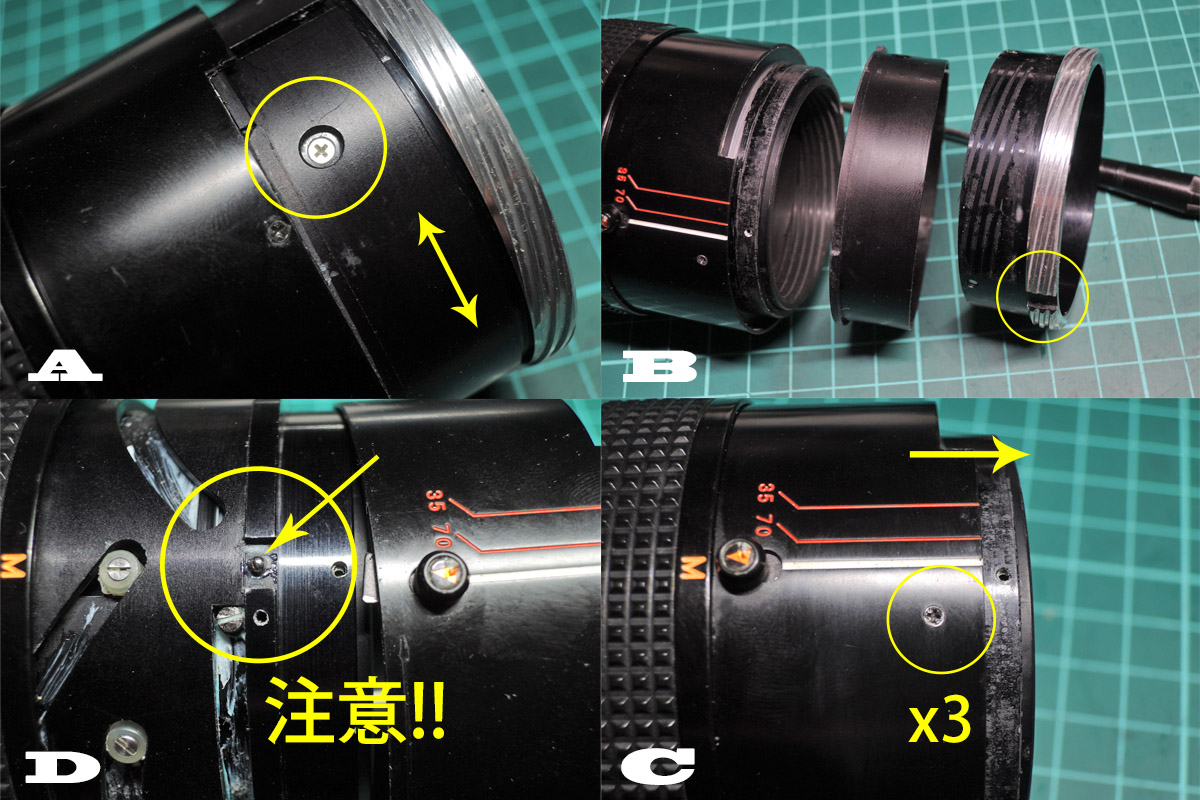 C: フォーカスリングゴムを外し、隠れていたネジ3個を外します。