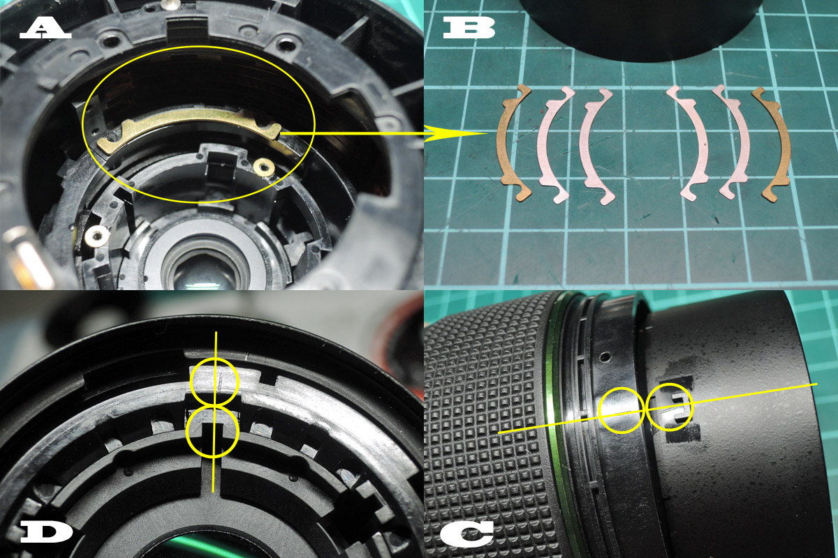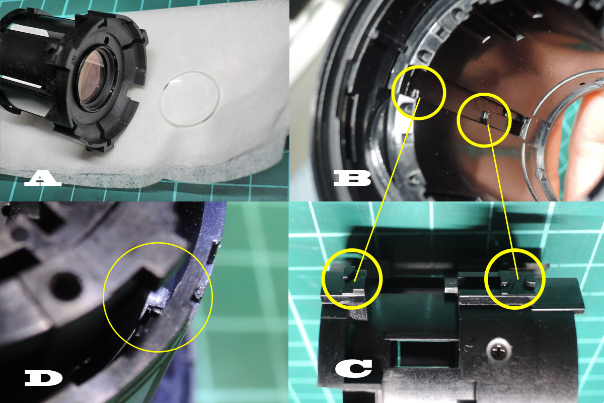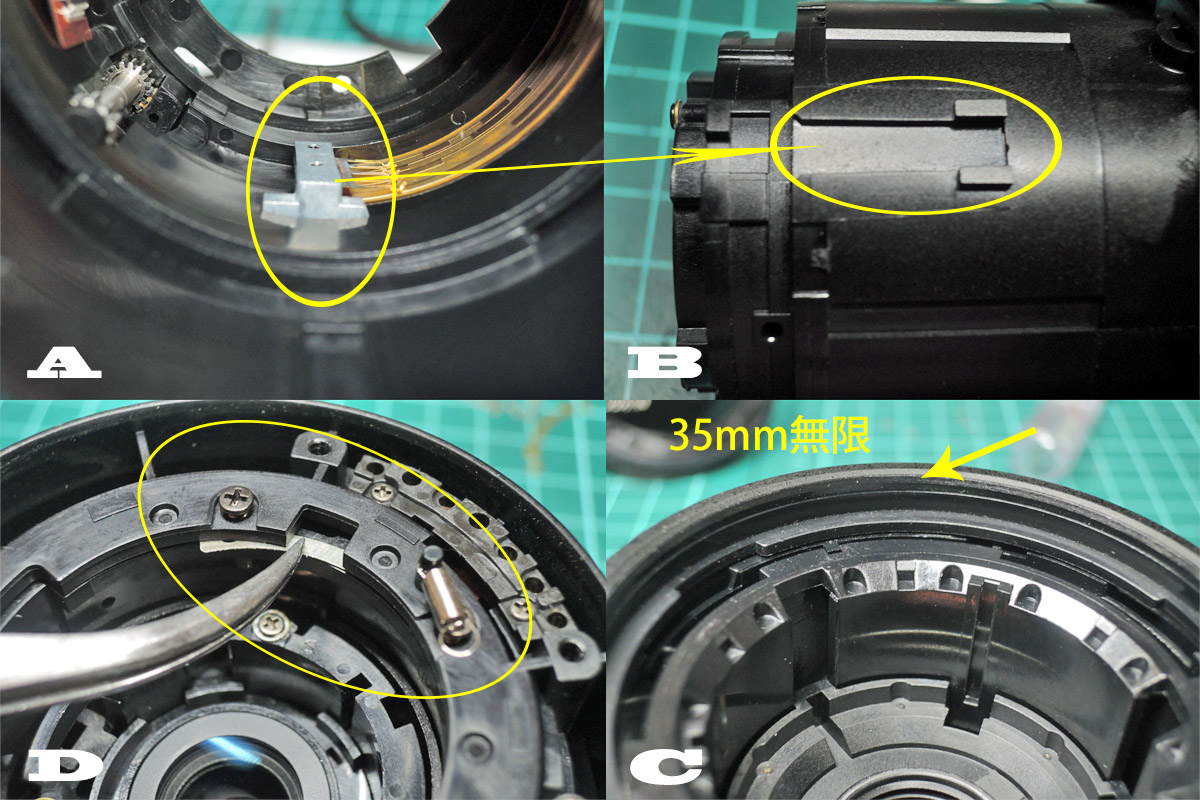 A: 鏡筒のズーム駆動部の凸をズームユニットの凹(画像B)に入れながら、鏡筒とズームユニットの固定位置(絞り連動棒の入るくぼみ)を合わせ、フォーカス部もマーキング位置に合わせて組みます。
