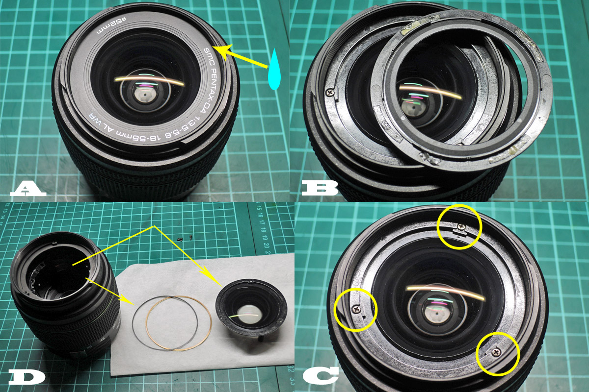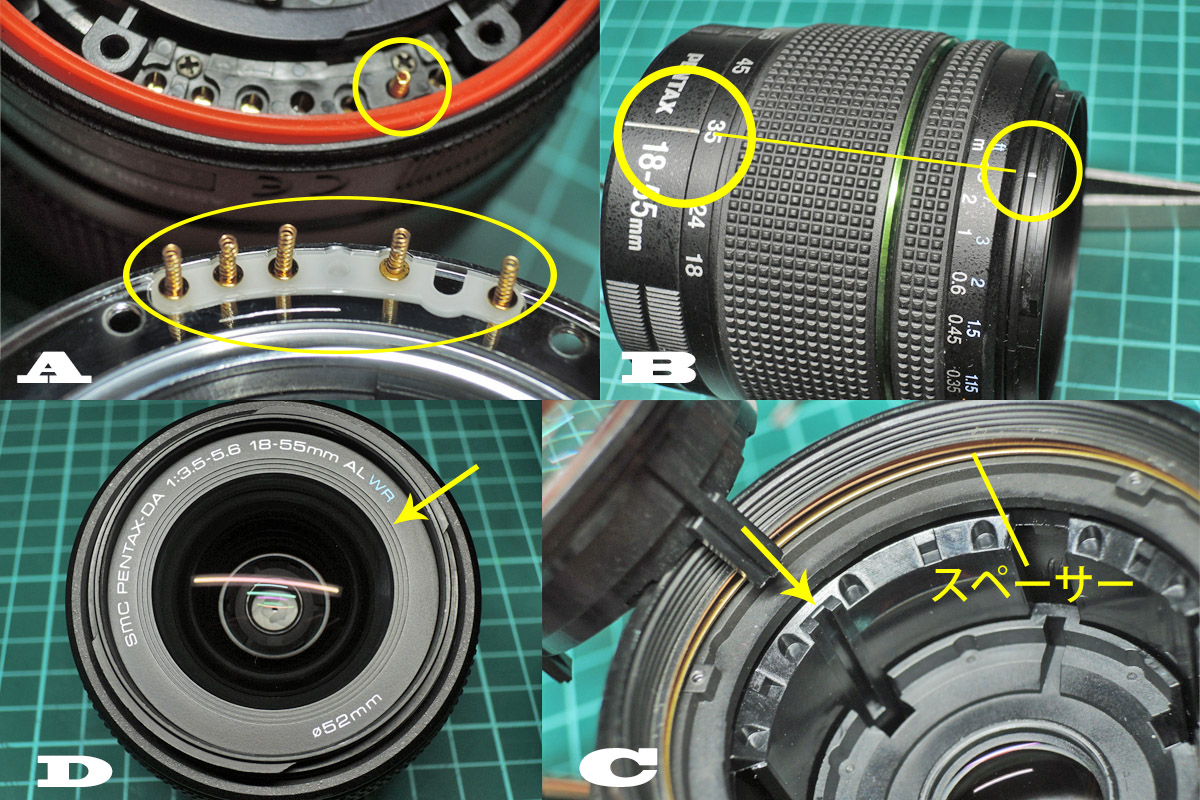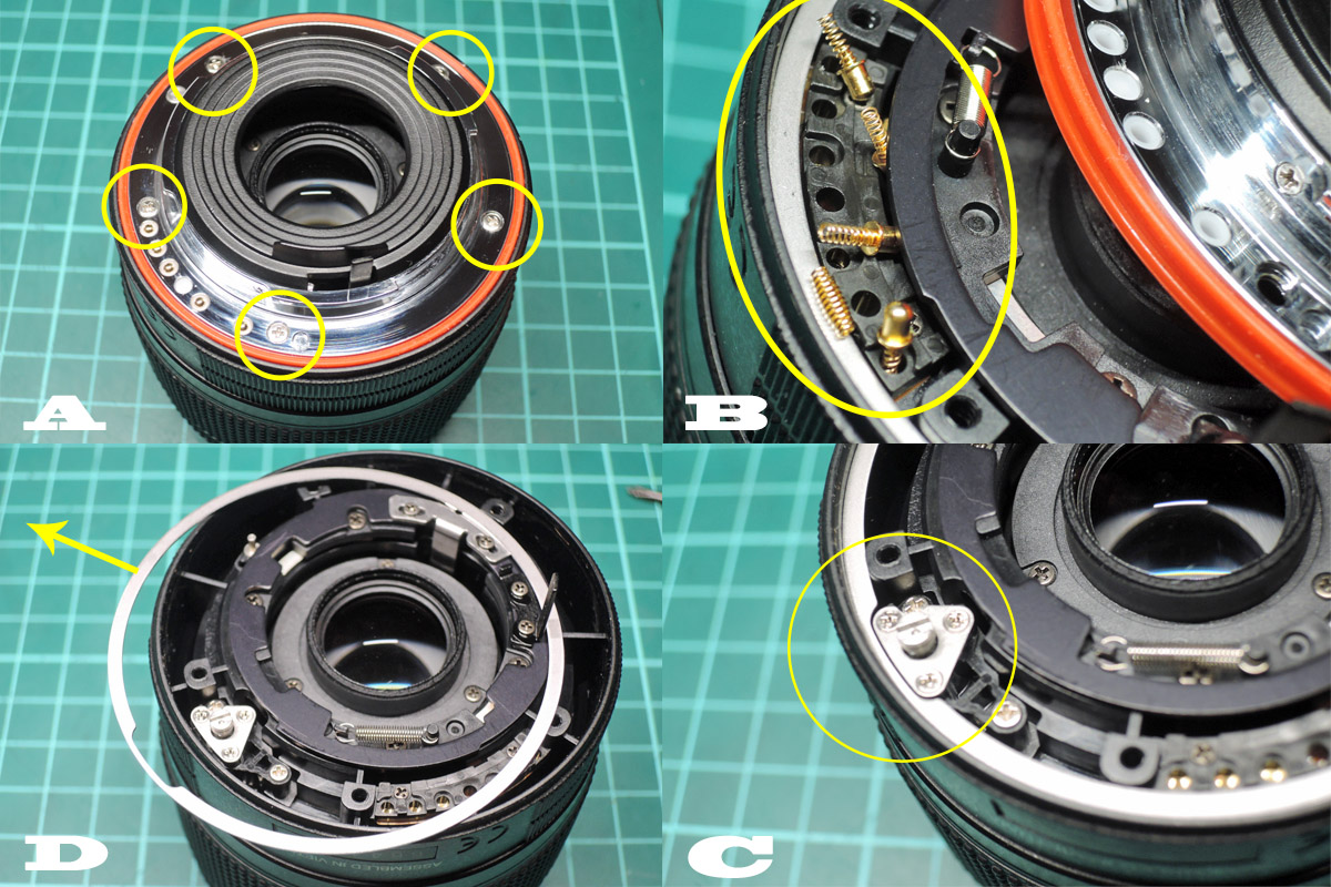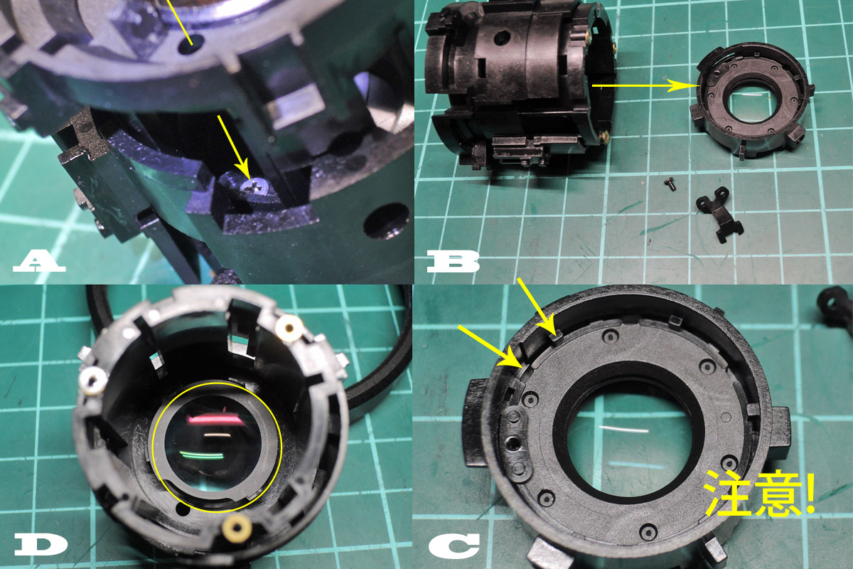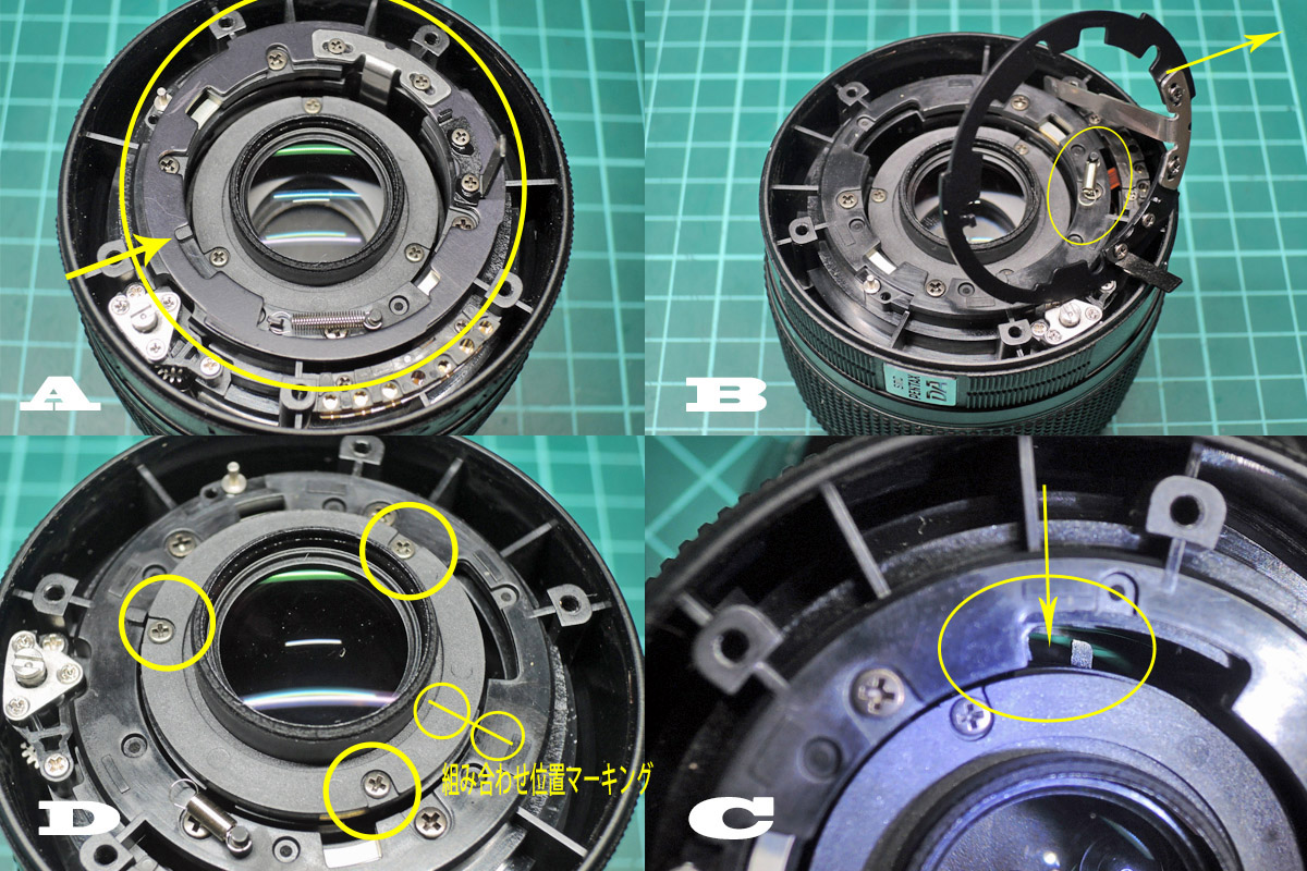 D: 4群レンズユニットを取り外す前に組み合わせ位置マーキングをし、3個のネジを外します。