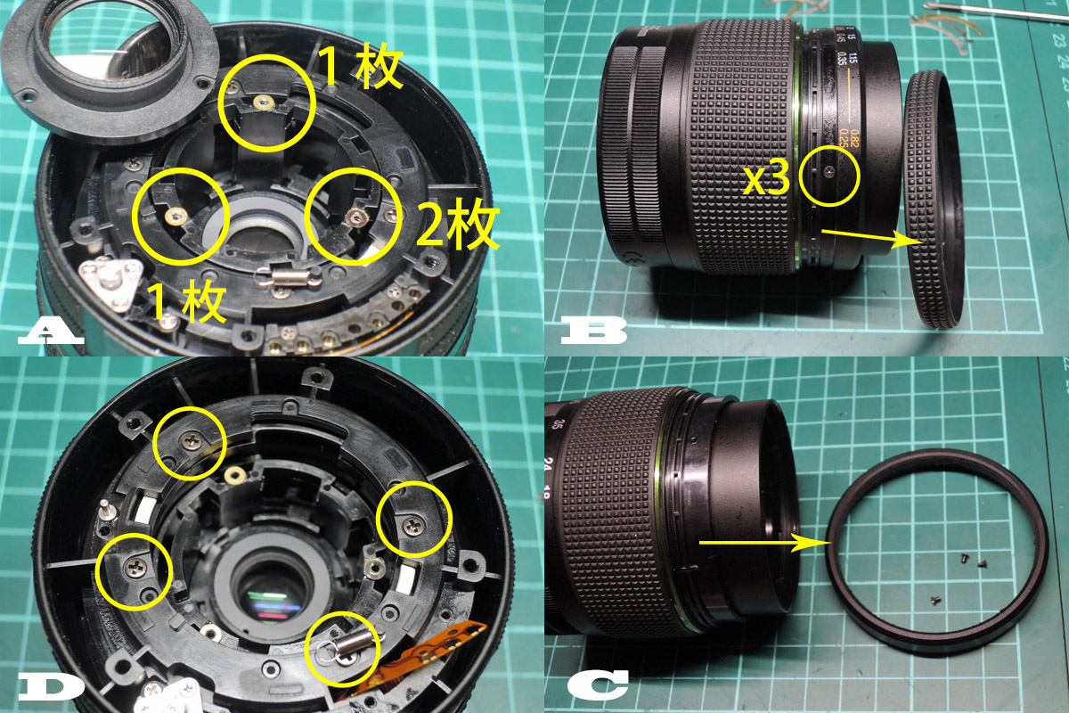 D: ズームユニットを固定している4個のネジを外しますが、本体とズームユニットの間にはスペーサーが入っているので気を付けて下さい。