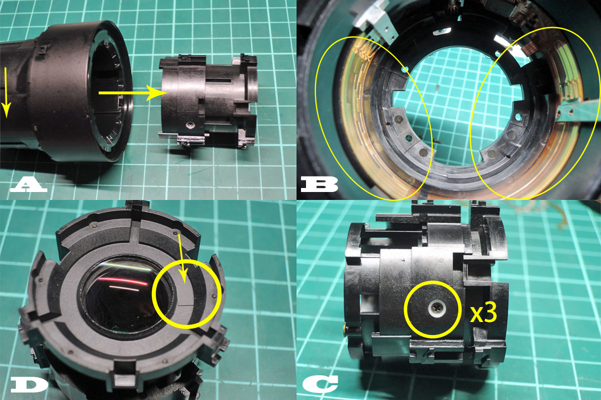 D: 3本のAF駆動レールの入っている位置を確認しながら1群レンズユニットを取り外し、挟んであるスペーサー2枚も回収しておきます。